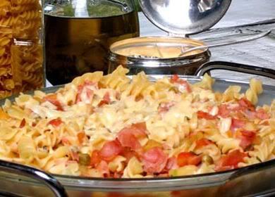 Cozinhar 1 pacote de macarrão parafuso na água fervente até ficar al dente, depois, escorrer e colocar em um pirex retangular untado com 2 colheres de sopa de manteiga.